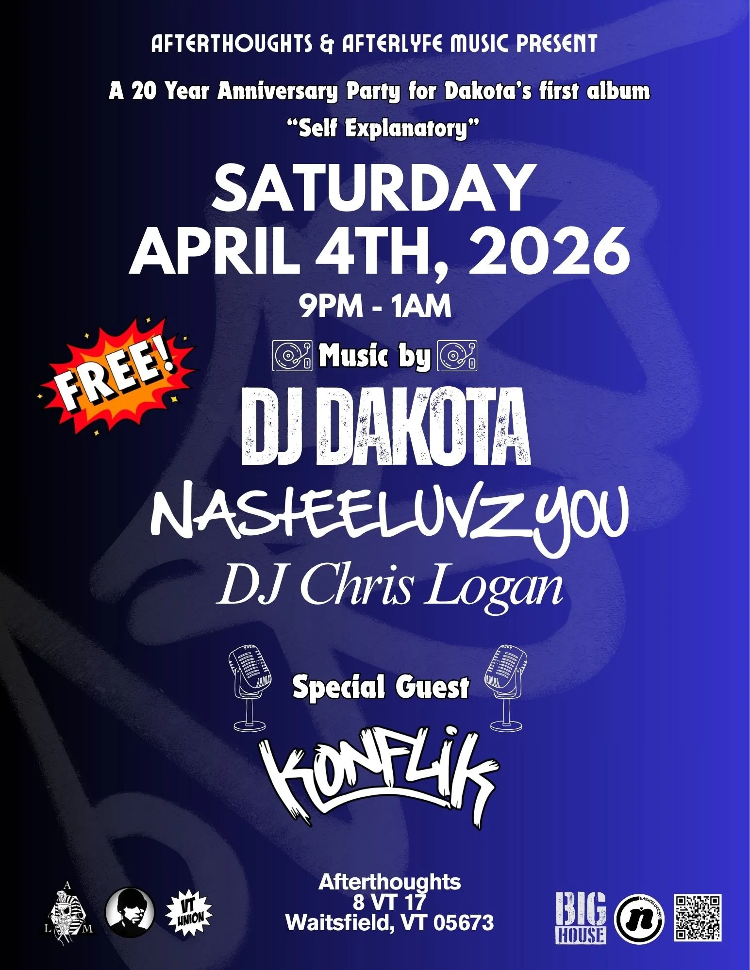 DJ DAKOTA ‘Self Explanatory’ 20 yr Album Anniversary Party Saturday, April 4, 2026 9:00 PM Sunday, April 5, 2026 1:00 AM Google Calendar ICS